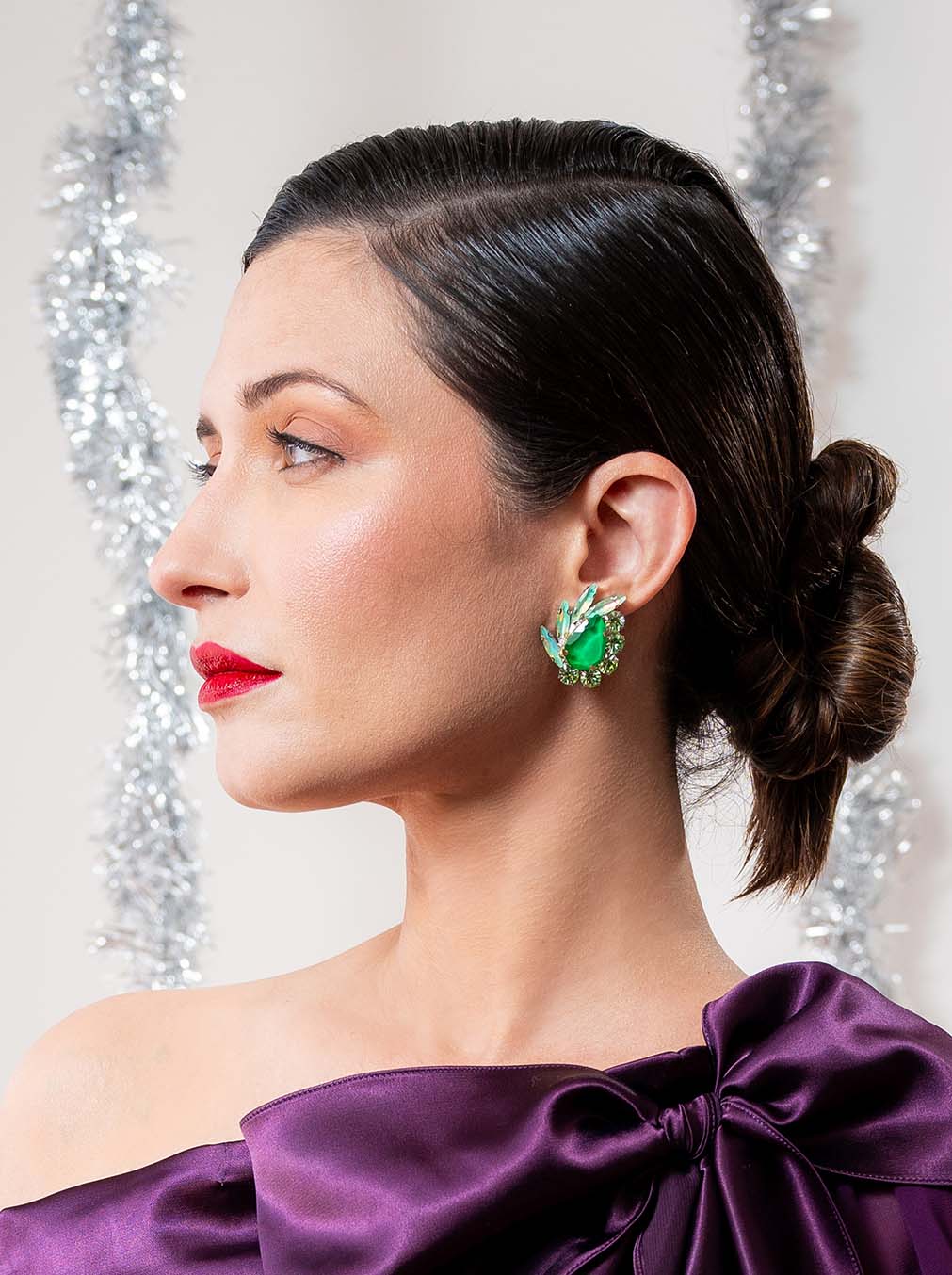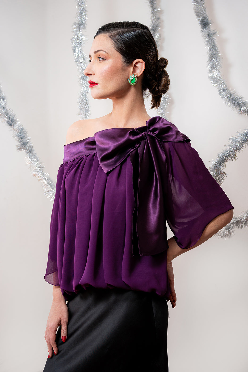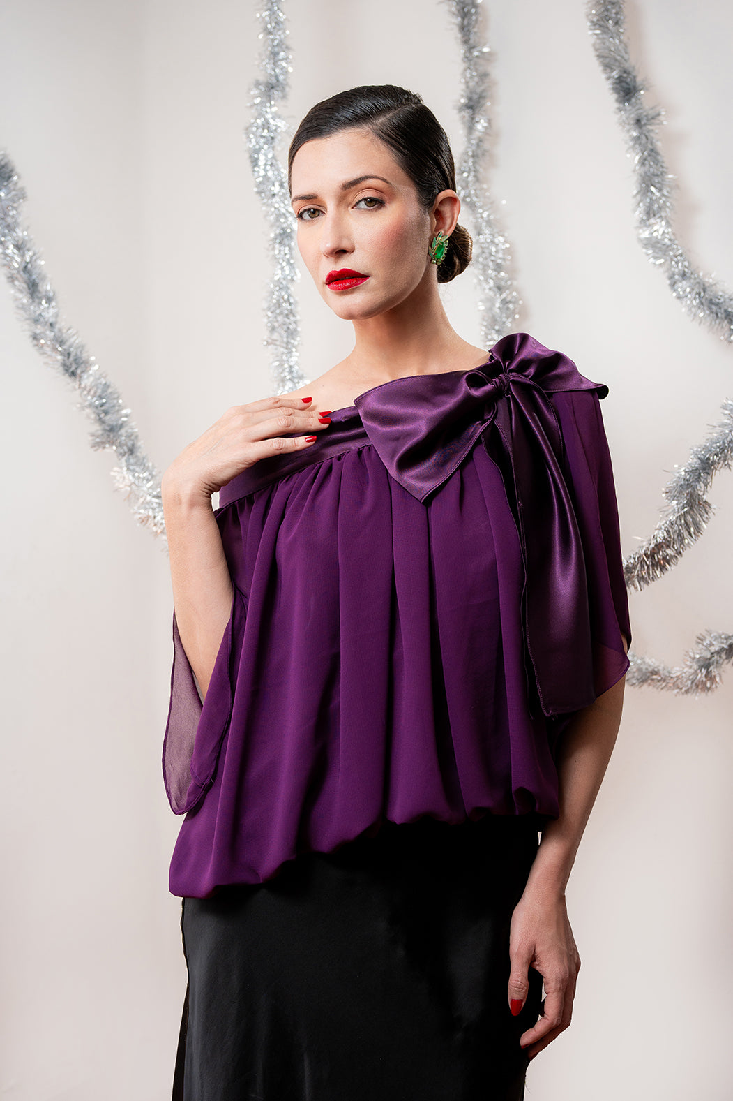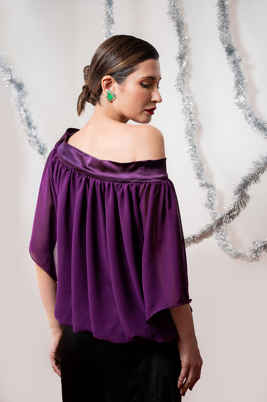 Top "bubble" morado en muselina con corte asimétrico de un hombro mangas campana en transparencia y escote marcado en satín con moño lateral.