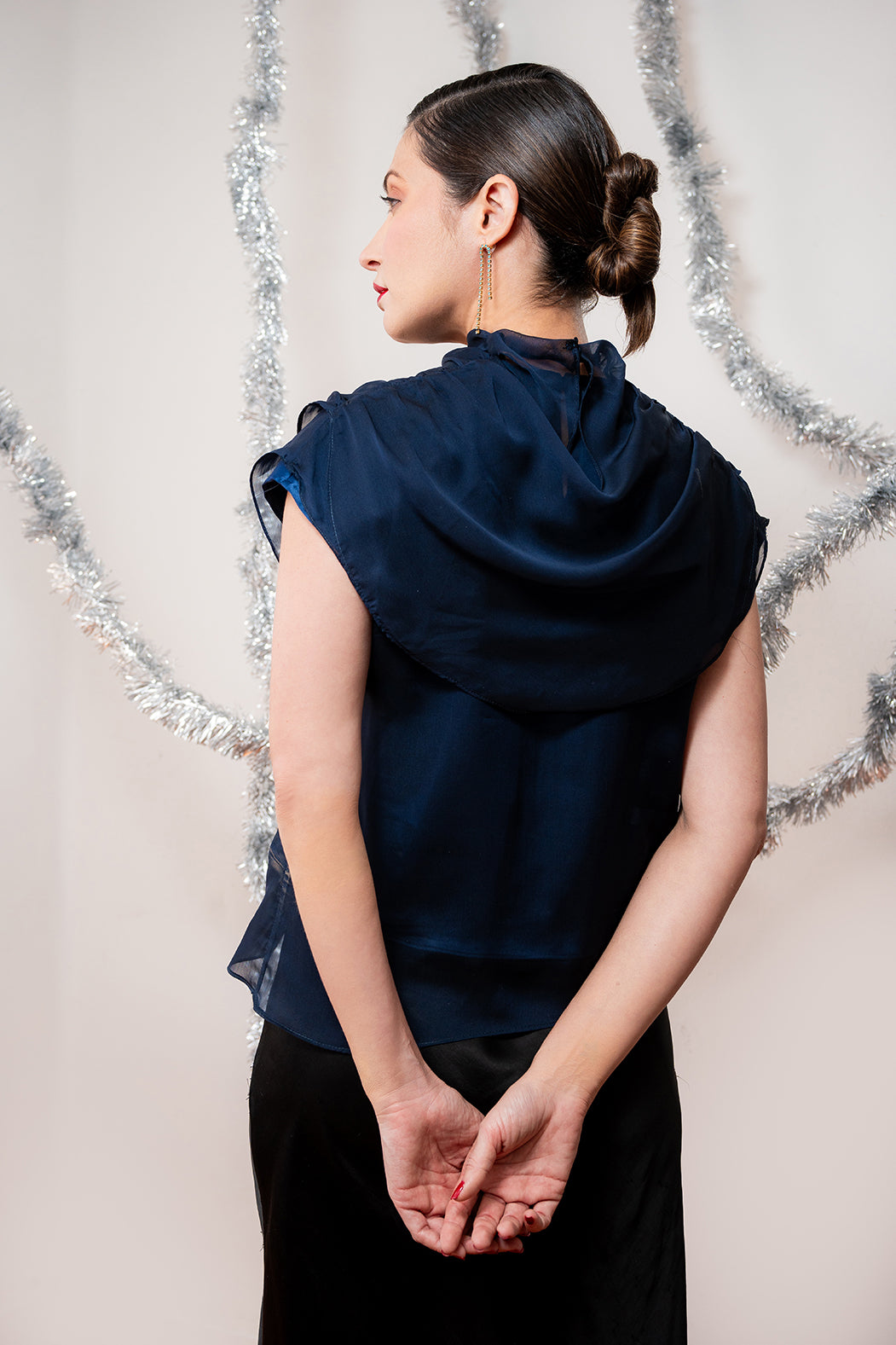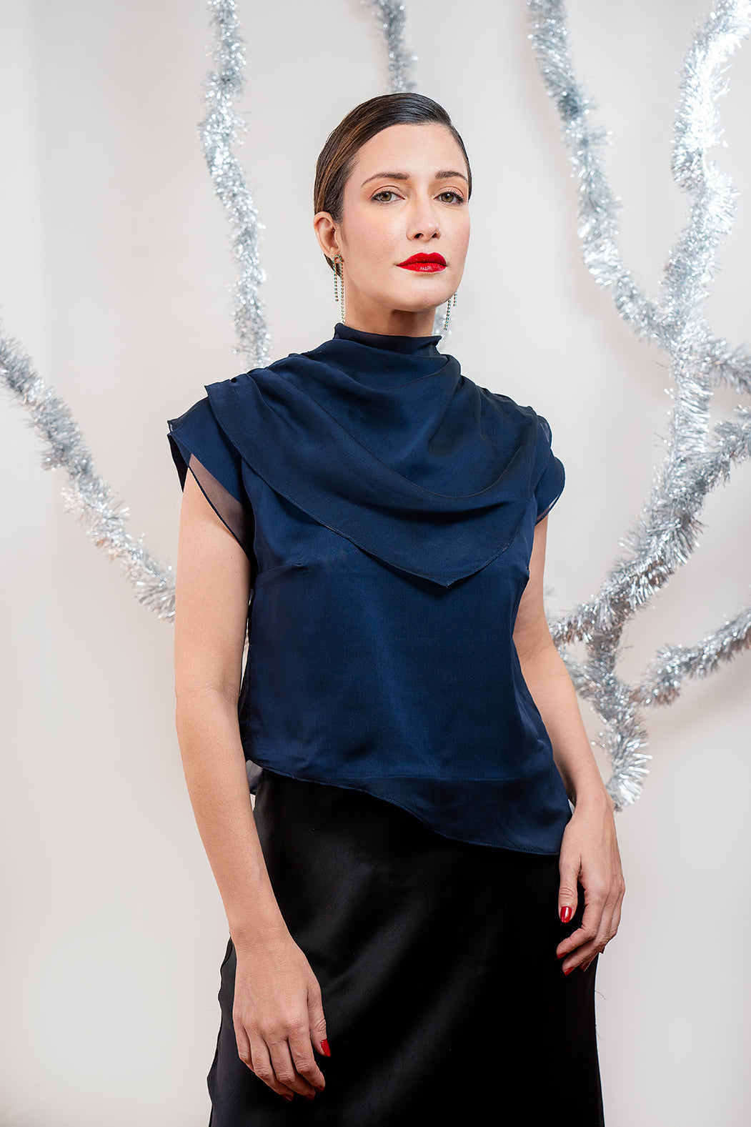 Top azul marino en chiffon con cuello alto drapeado tipo mascada.
